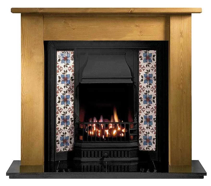The pine Lincoln is subtle and elegant, making it an excellent frame for the black tiled insert and handmade tubeline tiles. The insert is black, which really shows off the pretty patterned tiles, which works beautifully with the pine Lincoln surround. A beautiful fireplace package with a traditional yet modern feel, making it the perfect fireplace for any home.