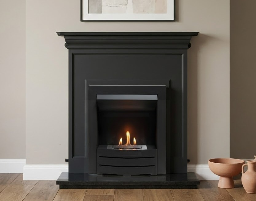 Looking for a traditional black cast iron fireplace on a flat wall with a real flame, have a look at our brand new package for Summer 2026, featuring our Barcelona fascia matched with our inset bio-ethanol unit.