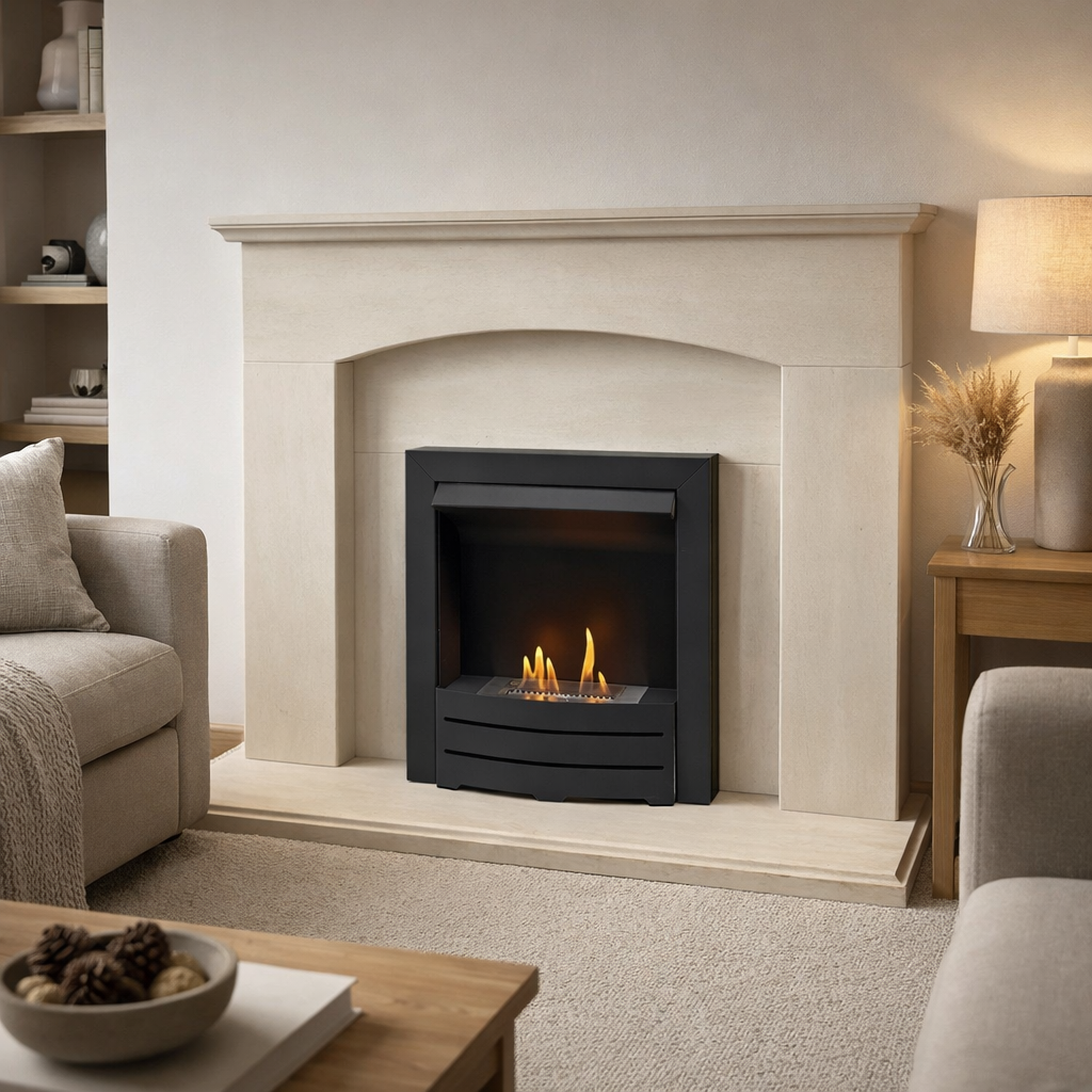 This modern and elegant fireplace, featuring a square curved arch detail, an ornamental mantel top, and a plain decorative hood plate, is the perfect addition to a modern home or a traditional property, and will take pride of place in any room. It pairs beautifully with our new 16″ Bio Ethanol Inset fire, making it ideal for contemporary interiors, especially those with a flat wall.