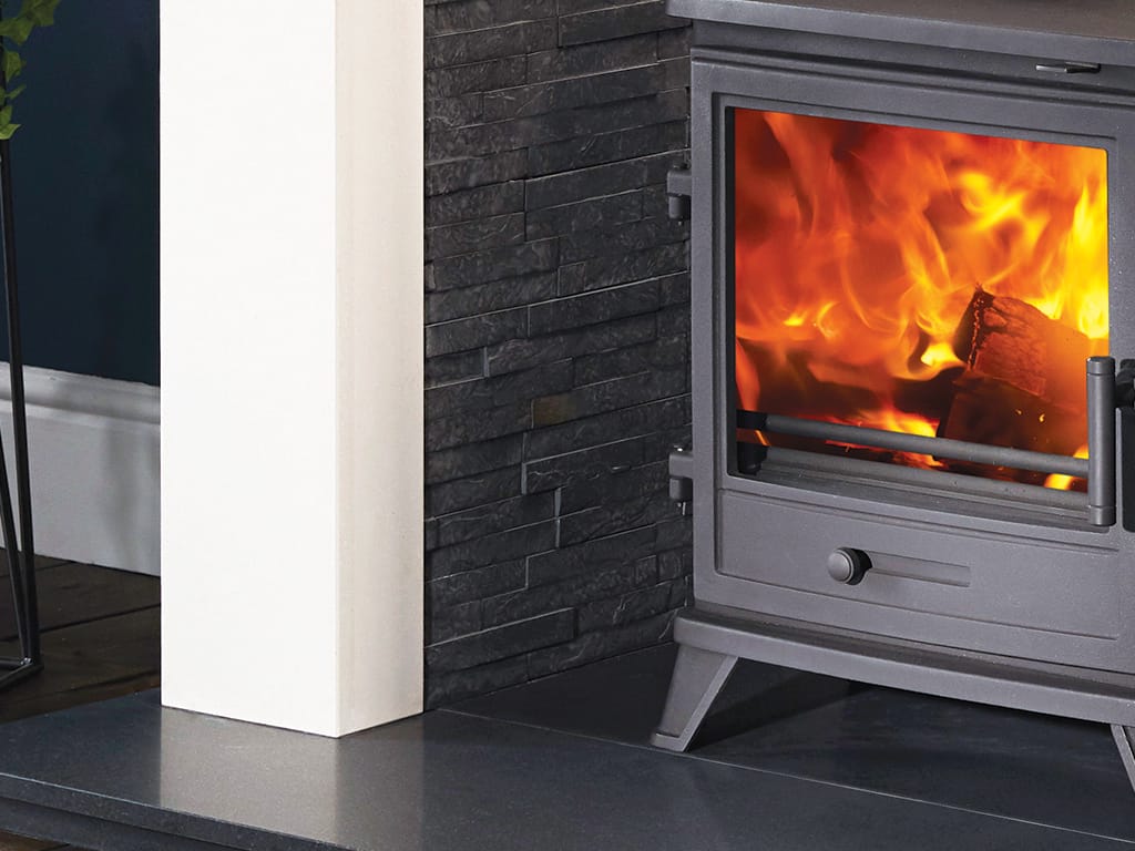 Pictured here in 54″ Agean Limestone with the Riven Slate chamber and Bassington Eco multi fuel stove.