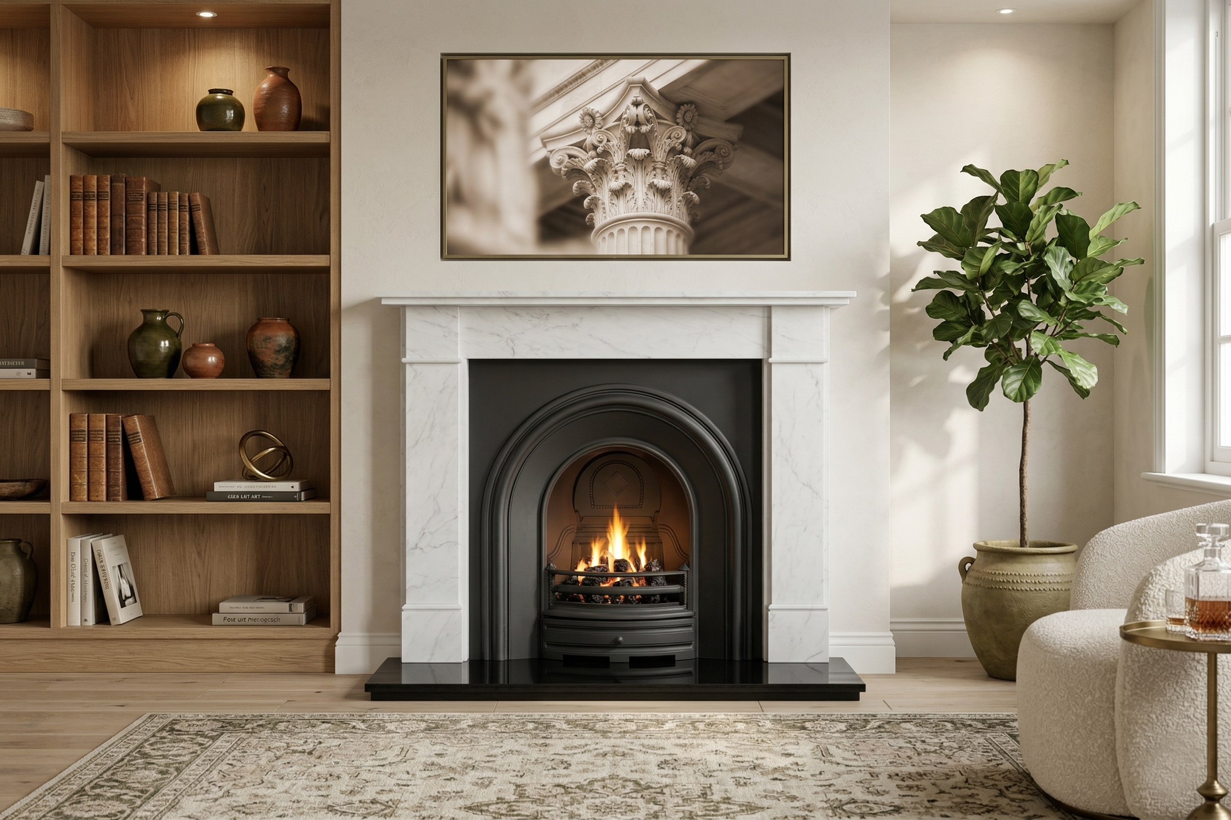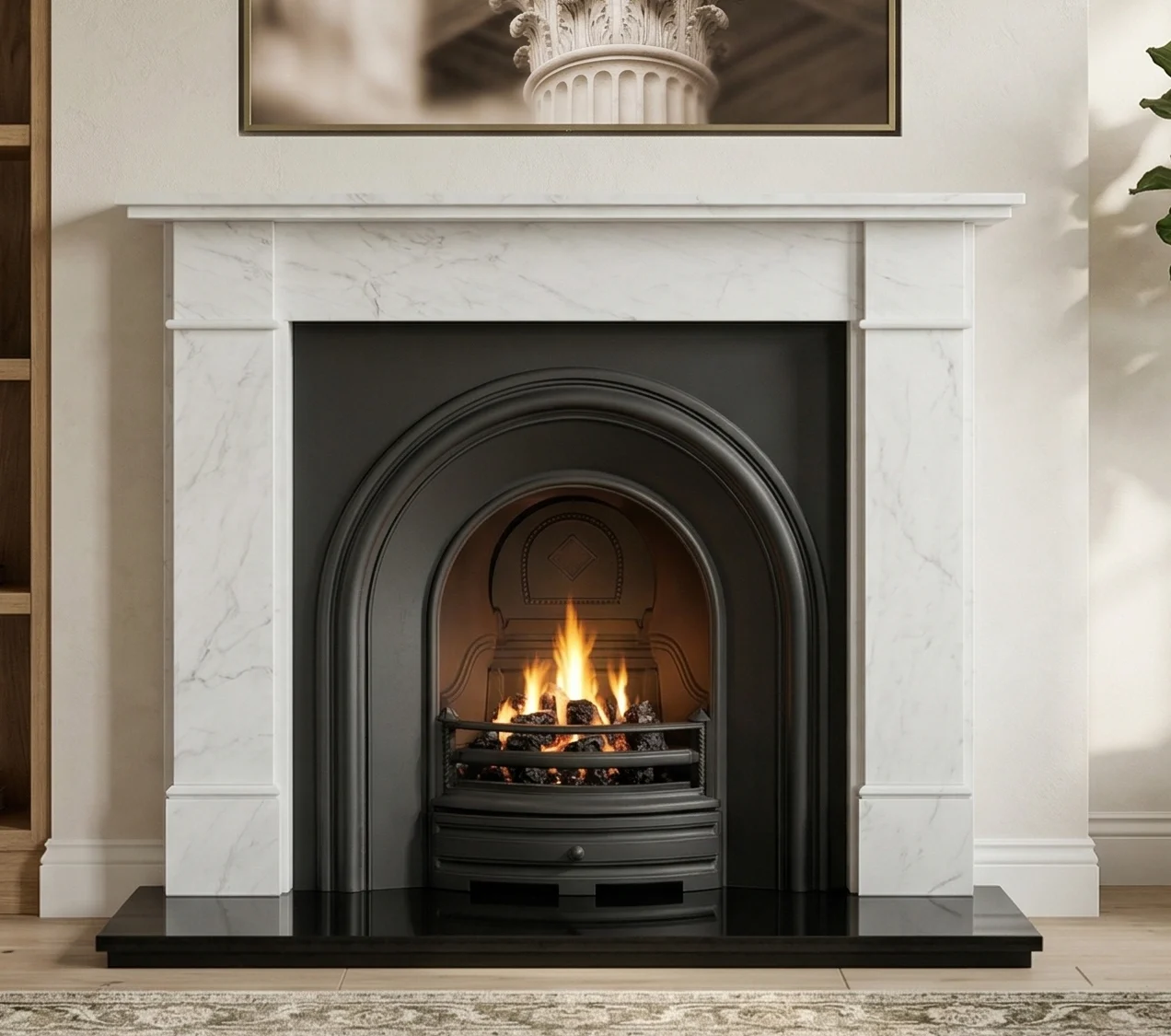 A simple Black arched fireplace with our new light honed Ariston Marble surround is a match made in fireplace heaven its oozes class and will look fantastic in any room, looking for a smaller size see our Coronet and Ariston marble.