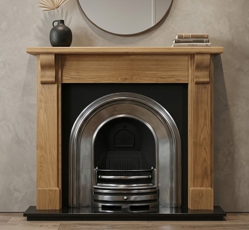 The simple, elegant Crown insert features a subtle curved arch, framed perfectly by the chunky solid oak Bedford surround, with scroll corbel detailing and thick, solid legs. A traditional fireplace package that will work brilliantly in a modern home, too.