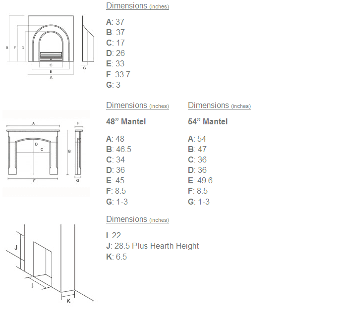Main Picture Shows Crown Black Arched Insert and 54″ Grand Corbel Mantel in Waxed Pine with Granite Hearth