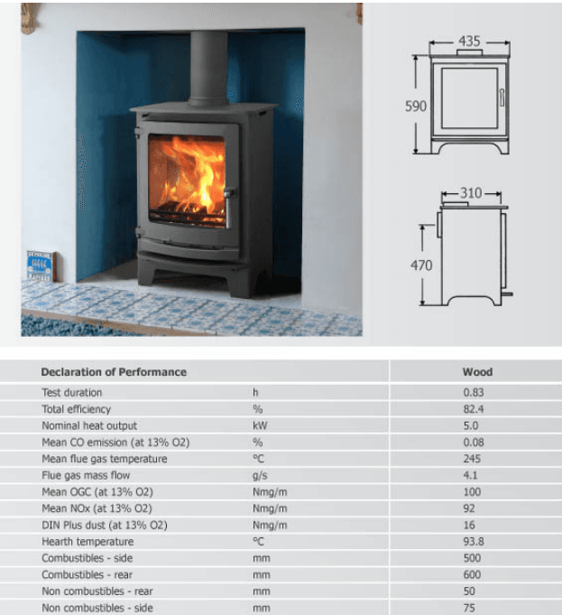 Using the correct rate of burning, efficiencies of up to 82.4%. The 5kW output can vary between 3.5 – 7kW depending on weight and type of wood being used.