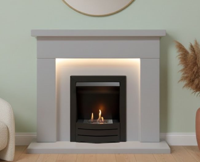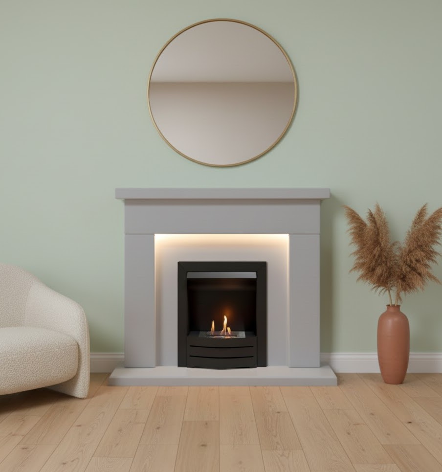 Looking for a traditional fireplace for a flat wall with a real flame, have a look at our brand new package for Summer 2026, featuring our Durrington suite in Polar white micromarble.