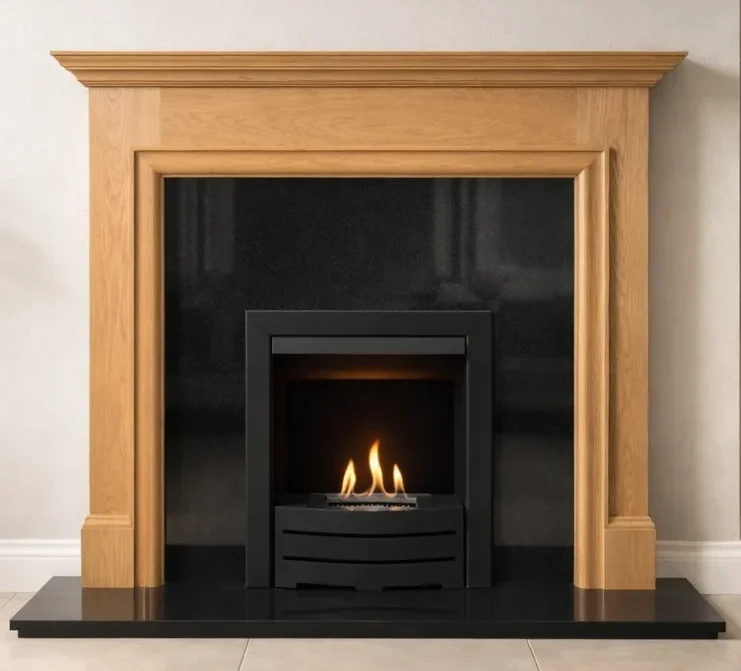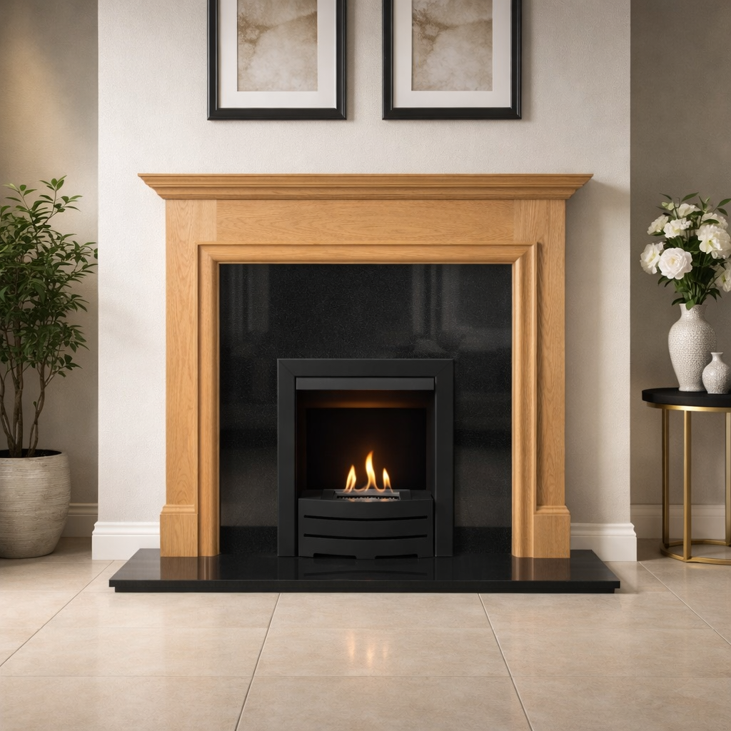Looking for a traditional fireplace for a flat wall with a real flame, have a look at our brand new package for Summer 2026, featuring our Oak Howard Surround, Granite hearth and back panel matched with our inset bioethanol unit or SLE40i Inset Electric fire.