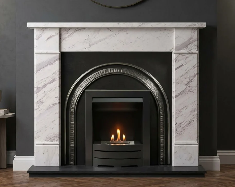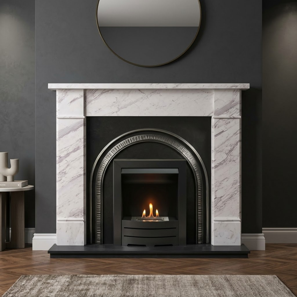 Looking for a traditional fireplace for a flat wall with a real flame, have a look at our brand new package for Summer 2026, featuring our 56″ Brompton Kallos Marble Surround, Heritage Fascia and Granite hearth matched with our inset bioethanol unit or SLE40i Inset Electric fire.