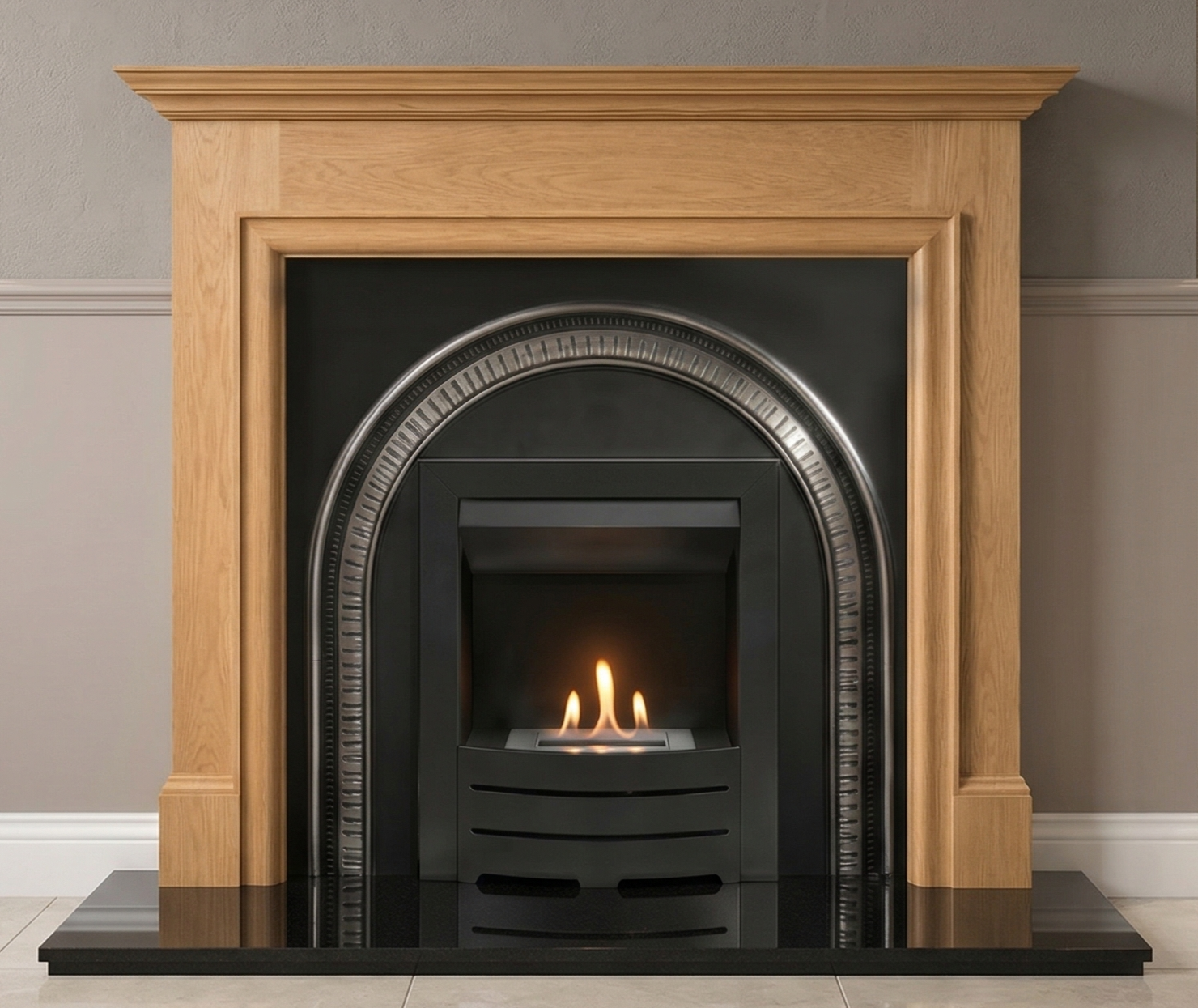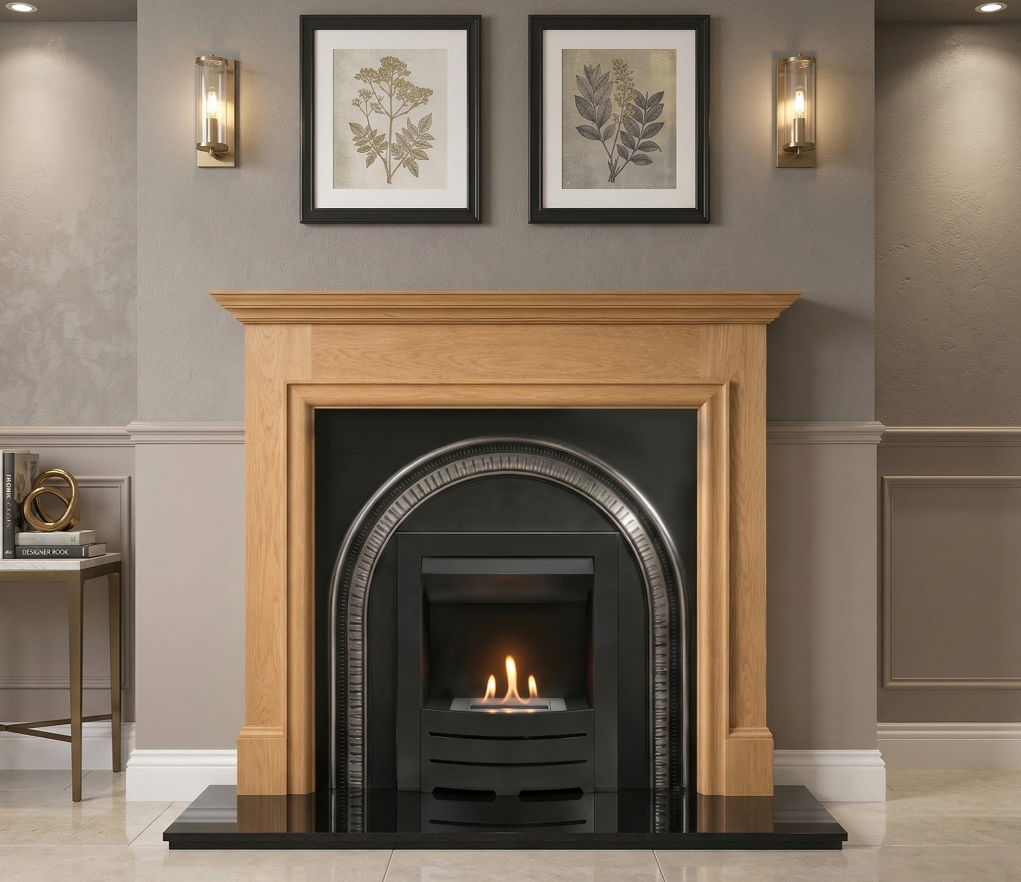 Looking for a traditional fireplace for a flat wall with a real flame, have a look at our brand new package for Summer 2026, featuring our Oak Howard Surround, Heritage Fascia and Granite hearth matched with our inset bioethanol unit or SLE40i Inset Electric fire.