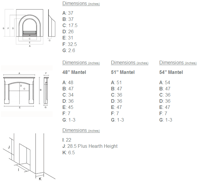 Main Picture Shows Henley Highlighted Arched Fireplace and 54″ Oak Lincoln Surround with Granite Hearth