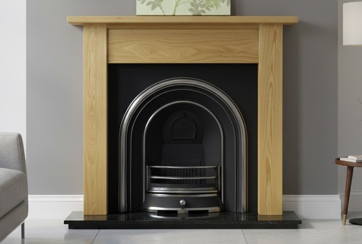 Our most popular insert teams with the simple yet solid solid oak Lincoln mantel in this package. The Jubilee features subtle arch detailing, while the oak Lincoln has a chunky, solid feel, creating an elegant, subtle fireplace that will take pride of place in any home.