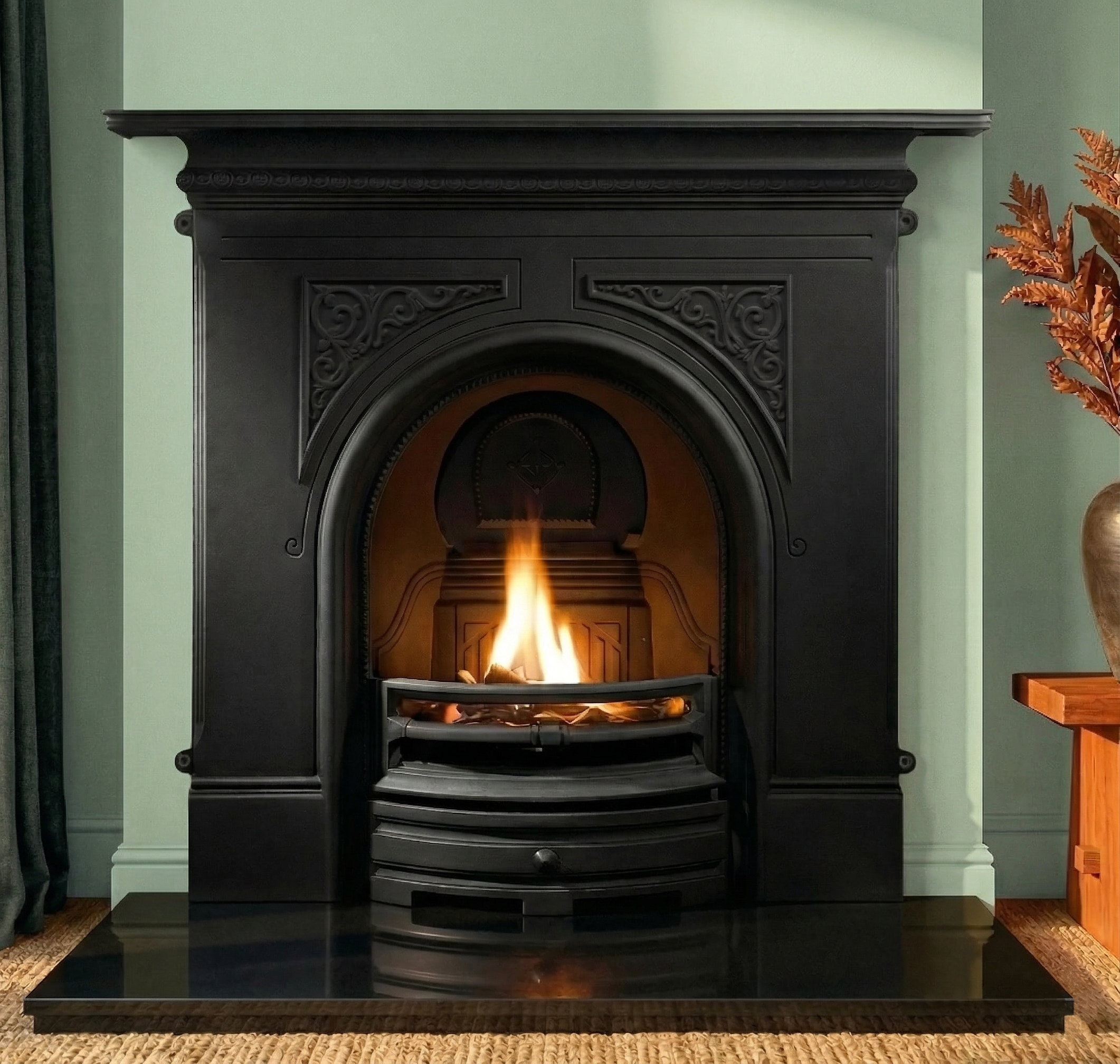The Pembroke cast iron fireplace is our best-selling combination fireplace, featuring a stunning arched design with elegant Celtic detailing. It’s compact in design, but doesn’t feel small and, with a chunky 48 inch shelf width, it’s solid enough to make a real style statement in any room.