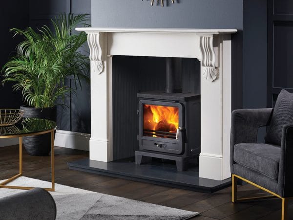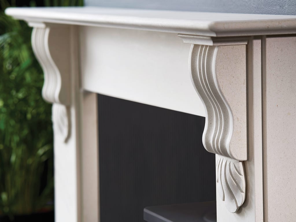 The Nuffield is available in Aegean Limestone, Carrara Marble and Liberty White, a versatile mantel that complements a range of different interior options as pictured here with a black reeded chamber and Vega Edge 200sl Eco stove.